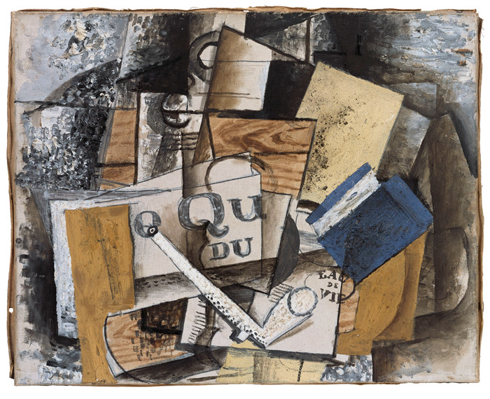 喬治·布拉克 《煙斗靜物(南方日?qǐng)?bào))》1914 布面油彩 33 × 41 cm 國(guó)立博古睿美術(shù)館-柏林國(guó)家博物館聯(lián)盟 NG MB 91/2000 攝影:bpk圖片社/國(guó)立博古睿美術(shù)館-柏林國(guó)家博物館聯(lián)盟/延斯·齊厄