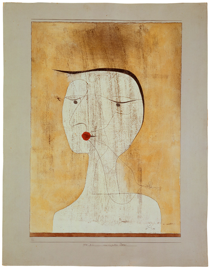 保羅·克利 《被封印的女子》1930 紙板貼紙上鋼筆與水彩,紙板下側(cè)邊上鋼筆與水彩 49 × 35 cm 國(guó)立博古睿美術(shù)館-柏林國(guó)家博物館聯(lián)盟 NG MB 140/2000 攝影:bpk圖片社/國(guó)立博古睿美術(shù)館-柏林國(guó)家博物館聯(lián)盟/延斯·齊厄