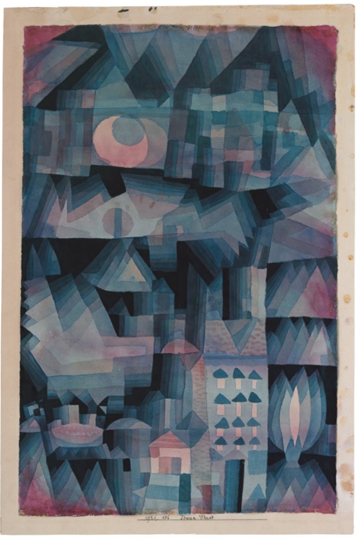 保羅·克利 《夢(mèng)之城》1921 紙板貼紙上水彩 47.5 × 31 cm 國(guó)立博古睿美術(shù)館-柏林國(guó)家博物館聯(lián)盟 NG MB 115/2000 攝影:bpk圖片社/國(guó)立博古睿美術(shù)館-柏林國(guó)家博物館聯(lián)盟/延斯·齊厄