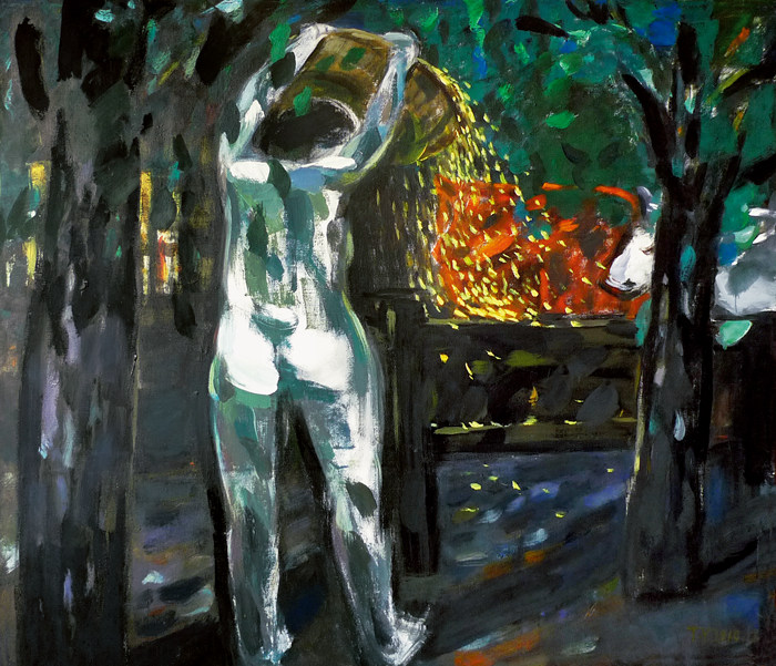鐵揚(yáng)作品的特點(diǎn)是充滿激情。無論他畫中鋪紅花被的炕頭女性,還是在蔥綠色玉米地里的姑娘,都有亮暗和大塊色彩對比,效果就像被陽光照亮的瞬間,畫中人成為關(guān)照的中心。而由于略去了五官細(xì)節(jié)和表情,我們看到的是柔和的皮膚和跳躍的光色,畫中女性就成為明亮的發(fā)光體。