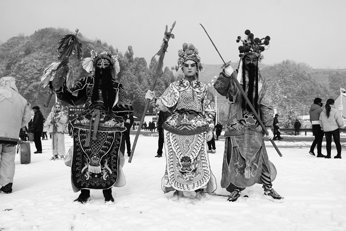 隴縣鄉(xiāng)村社火隊走在皚皚白雪中 喬曉光拍攝 2019年 圖片來源:《村莊里的藝術》
