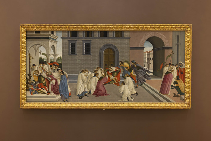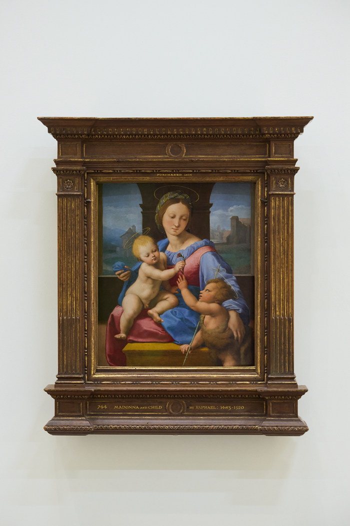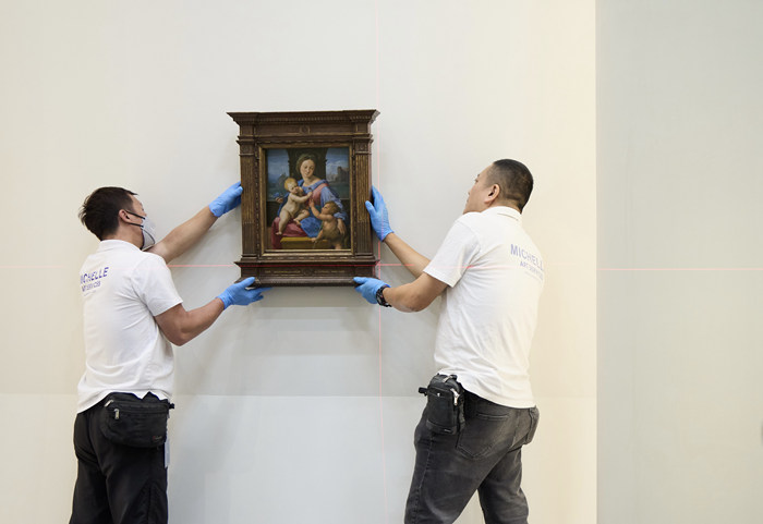 率先亮相的八幅經(jīng)典名作包括文森特 ·梵高(1853–1890年)的《長草地與蝴蝶》(1890年);以及展覽“宗教藝術(shù)”單元的多幅重點(diǎn)畫作──桑德羅·波提切利(約 1445–1510年)的《圣芝諾比烏斯的三個(gè)奇跡》(約 1500年);拉斐爾(1483–1520年)的《圣母子與施洗者約翰》(加瓦圣母)(約 1510–1511年);昆廷·馬西斯(1465或 1466–1530年)的《寶座上的圣母子和四位天使》(約 1506–1509年前);桑索菲萊托(1609—1685年)的《祈禱的圣母》(1640–1650年);圭多·雷尼(1575–1642年)的《抹大拉的瑪利亞》(1634–1635年);喬瓦尼·貝利尼(約 1435–1516年)的《圣母子》(可能作于 1480–1490年),以及安東尼羅·達(dá)·梅西納(活躍于 1456年,卒于 1479年)的《書房中的圣哲羅姆》(約 1475年)。