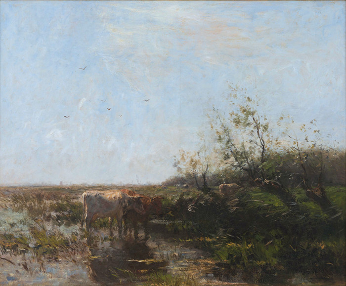 牛和風車一樣,自17世紀以來一直是荷蘭藝術(shù)最常見的“國家”主題。海牙畫派威廉·馬里斯的代表作就是以牛等動物為主的荷蘭風景畫,觀感會讓人聯(lián)想到柯羅的作品。他曾說過一句與牛相關(guān)的金句:“我不畫牛,而是畫光(Ik schild geen koeien, maar licht)”。