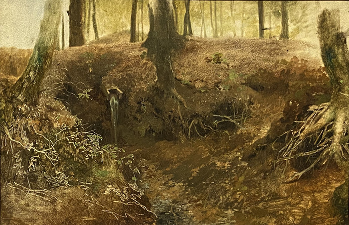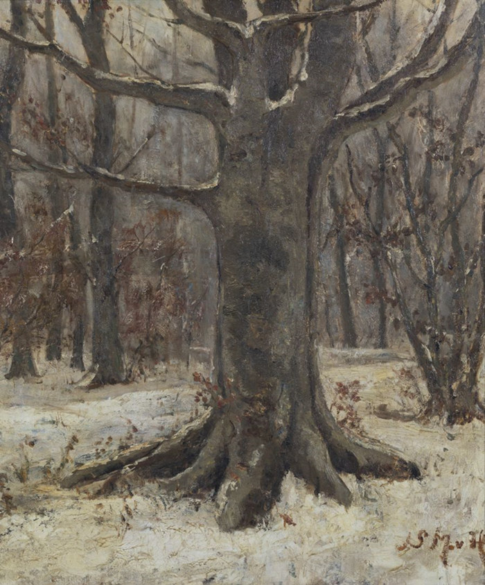 亨德里克·梅斯達格的妻子西娜·梅斯達格-范·侯登也是一名畫家,海牙畫派的風景畫多為夏秋之景,展覽現(xiàn)場展出的西娜之作描繪的則是雪中的山毛櫸樹,其中的樹干也是十分海牙畫派的灰。