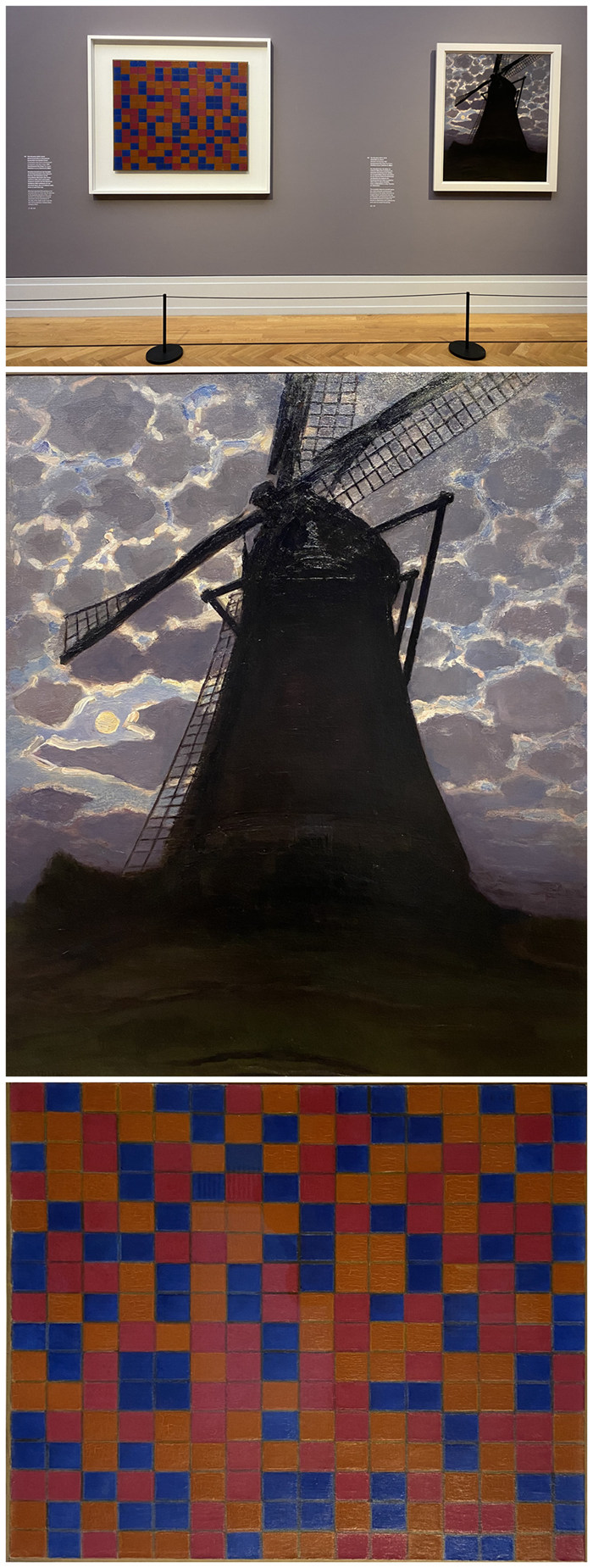 那是一個(gè)充滿變革的年代,藝術(shù)家們?cè)趯ふ易晕业乃囆g(shù)之路上步履不停。蒙德里安在畫下《夜風(fēng)車》的1917年,發(fā)表了他的抽象理論。在展覽現(xiàn)場(chǎng),《夜風(fēng)車》的旁邊擺放的是兩年后創(chuàng)作的《網(wǎng)格8的組成》,被蒙德里安描述為星空的重建,這是他搬到法國巴黎之前在荷蘭畫的最后一幅作品。蒙德里安最終從具象繪畫轉(zhuǎn)向抽象風(fēng)格,成為20世紀(jì)抽象藝術(shù)的先驅(qū)、風(fēng)格派運(yùn)動(dòng)中最有名的藝術(shù)家。