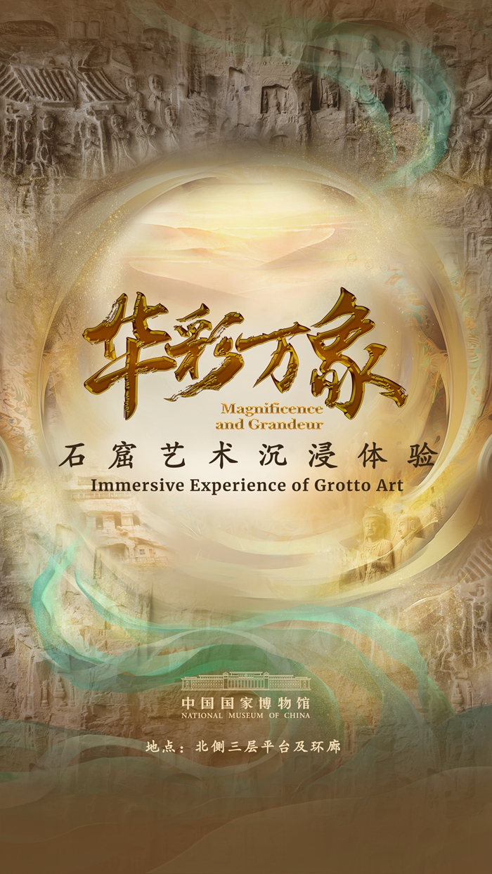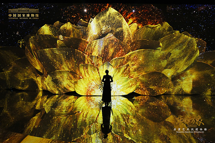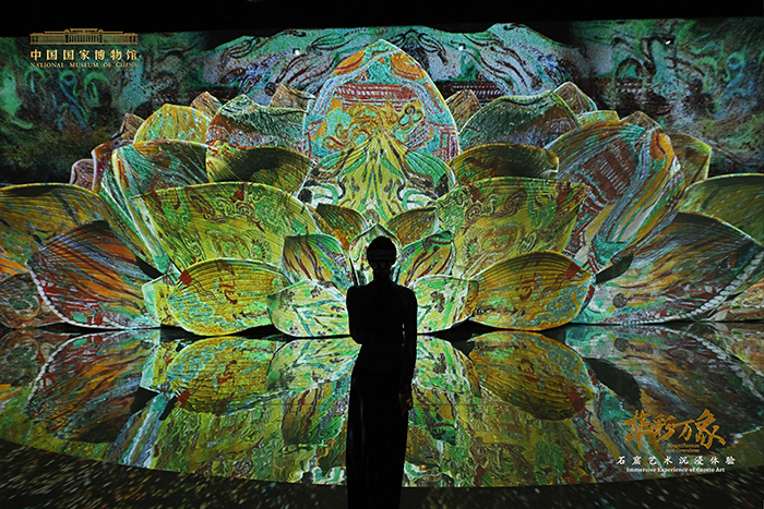 2023年12月9日,“華彩萬象——石窟藝術沉浸體驗”在中國國家博物館北側(cè)三層平臺及環(huán)廊正式對公眾開放。本次沉浸體驗展陳空間約1500平米,首次以盛開的蓮花作為造型主體設計成巨型數(shù)字裝置,藝術家們結合數(shù)字繪制、數(shù)字3D Mapping影像和AI算法技術,以當代眼光和獨特視角來表現(xiàn)、挖掘和闡釋克孜爾石窟、敦煌莫高窟、麥積山石窟、云岡石窟和龍門石窟的藝術風格與豐富內(nèi)涵。以“菱格世界”“萬古遺珠”“東方微笑”“十方同源”“奇崛妙境”組成“藝術時空體驗區(qū)”,另有“教學互動體驗區(qū)”及“衍生藝術品區(qū)”等,共同組成全景沉浸體驗環(huán)境,石窟藝術得到全新演繹。