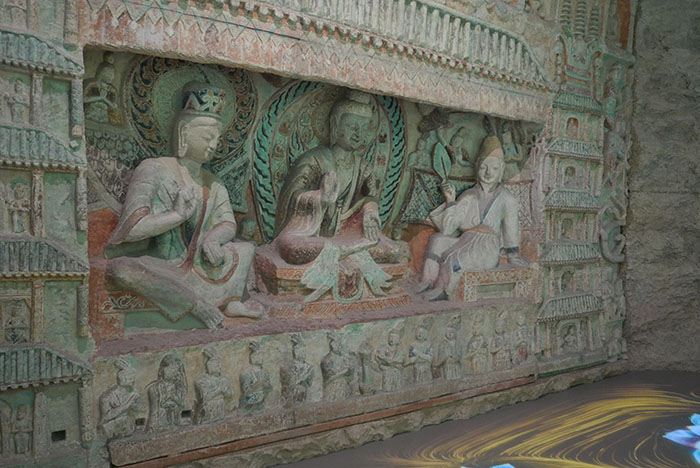 “藝術時空體驗區(qū)”分為五個板塊,每個板塊本身就是一件裝置藝術作品,表達五個石窟的各自特點。按照由西向東的石窟地理位置排序,通過沉浸式影像加以聯(lián)系。