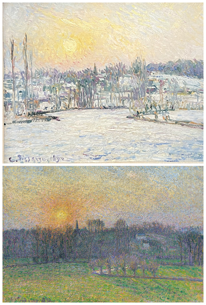 卡米耶·畢沙羅(Camille Pissarro,1830-1903),1892,上圖:《雪景日落》(View of Bazincourt,Snow Effect,Sunset);下圖*:《日落即景》(Blick auf Bazincourt,Sonnenuntergang)