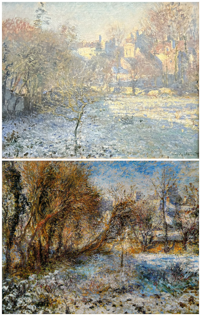 上圖:《霜》(Frost),克勞德·莫奈(Claude Monet,1840-1926),1875;下圖*:《雪景》(Paysage de neige),雷諾阿(Pierre-Auguste Renoir,1841-1919),1875,法國(guó)巴黎橘園美術(shù)館藏品(Musée de l'Orangerie,Paris)