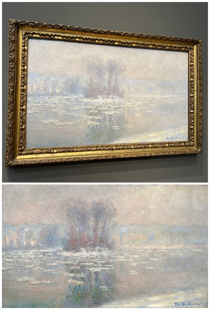 相較于雷諾阿,莫奈的畫(huà)看起來(lái)有些“素”?但莫奈其實(shí)畫(huà)的是五彩斑斕的白,這幅《浮冰》實(shí)屬現(xiàn)場(chǎng)最佳,筆觸觀感極其驚艷,翻拍只能展現(xiàn)其魅力百之一二。畫(huà)中樹(shù)木倒影與浮冰的展現(xiàn),已能夠令人聯(lián)想到莫奈晚期的睡蓮圖。