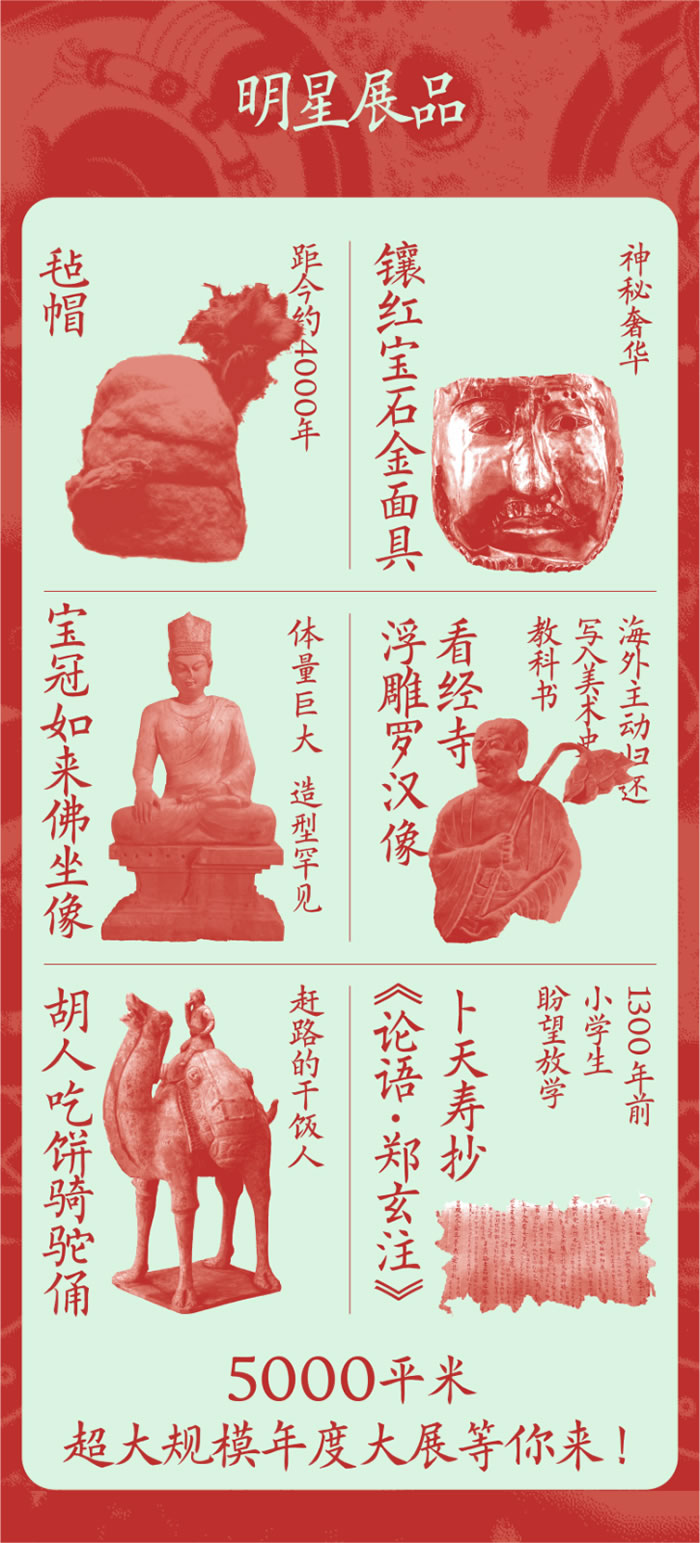 展覽藝術(shù)名作薈萃,例如:距今約4000年的新疆小河墓的氈帽質(zhì)樸神秘;戰(zhàn)國(guó)至南北朝時(shí)期的黃金面具鑲嵌著奢華的紅寶石;龍門石窟擂鼓臺(tái)南洞初唐“寶冠佛”重達(dá)7噸,宏雄壯麗;龍門看經(jīng)寺浮雕羅漢像被盜海外終回歸的經(jīng)歷充滿傳奇;趕路的干飯人胡人吃餅騎駝俑描述著千年前生意人的場(chǎng)景;唐代的小學(xué)生一邊抄寫《論語(yǔ)》,一邊請(qǐng)求先生早放學(xué),回家是孩子最真切的期盼,以及多件“國(guó)寶級(jí)”文物首次在京亮相……眾多精彩文物充滿傳奇色彩和歷史的厚重與故事,為公眾制造出跨越時(shí)空的藝術(shù)場(chǎng)域。