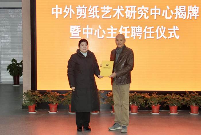 中外剪紙藝術(shù)研究中心聘任喬曉光擔(dān)任主任,張艷霞為喬曉光頒發(fā)聘書