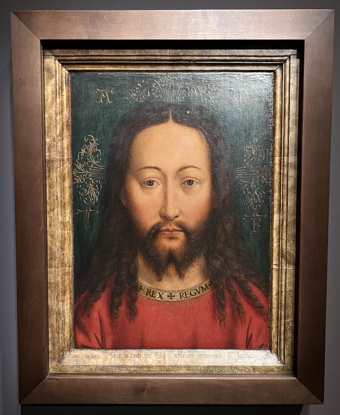 除了以上5幅肖像外,特展現(xiàn)場還有一幅宗教畫其實(shí)也算是“肖像”,主角是耶穌。這幅畫遵循了中世紀(jì)盛期常見的圣像類型,風(fēng)格上也很接近揚(yáng)?凡?艾克的作品,上面甚至還有他的簽名和日期,但據(jù)研究結(jié)果顯示,這幅作品是在揚(yáng)?凡?艾克離世60多年后完成的。