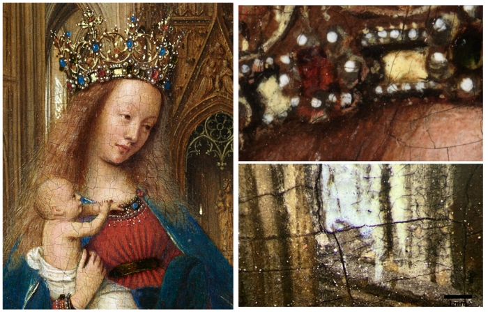 在《教堂圣母子》中,揚(yáng)?凡?艾克僅靠顏料就創(chuàng)作出了圣母金冠上珍珠和寶石的光芒。不過研究人員通過立體顯微鏡檢測,發(fā)現(xiàn)窗戶附近的光區(qū)使用了銀箔,這一復(fù)雜運(yùn)用應(yīng)該是源自另一項(xiàng)古老技術(shù)。
