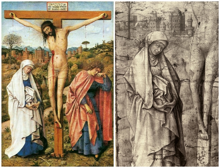 左圖:《耶穌受難》(The Crucifixion),揚(yáng)?凡?艾克工作室,約1430/40,布面油畫;右圖:紅外線反射映像下的局部細(xì)節(jié)