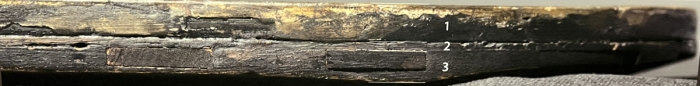 整幅作品面板分為三層,1為畫框外架,2為原始橡木畫板,3為背部支撐板