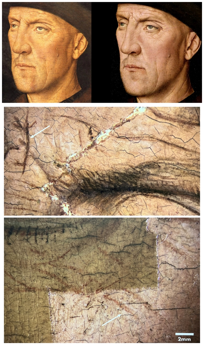 中圖:白色剪頭指向鼻子山根的疤痕;下圖:去除清漆后,眼部區(qū)域的皺紋細(xì)節(jié)重現(xiàn)