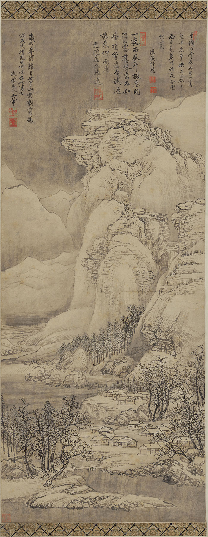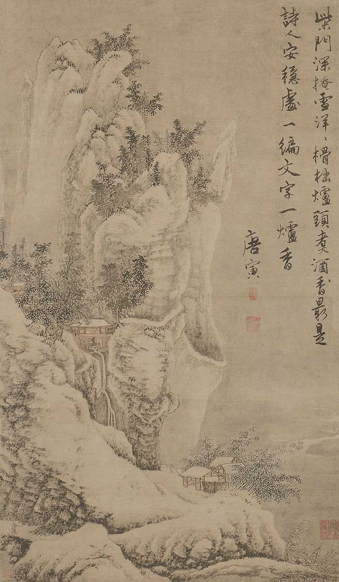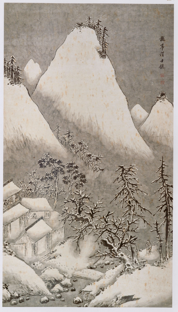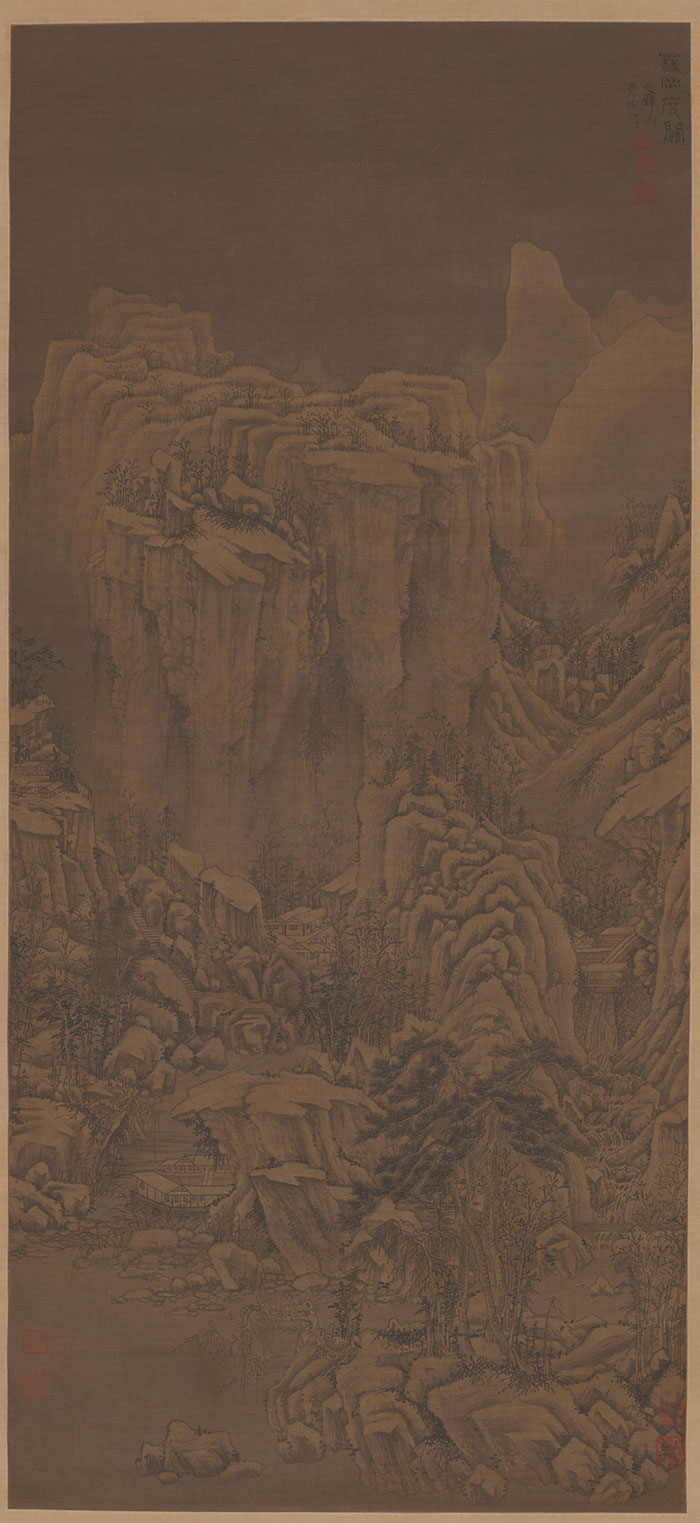 圖繪崇山峻嶺為積雪覆蓋,崖頭隱約點綴著短小的叢樹,山谷間有林木、水榭掩映,雪霧煙嵐在崖隙間彌散,山腳下,長松依然清翠昂然,整個畫面散發(fā)著荒寒蕭索之氣。