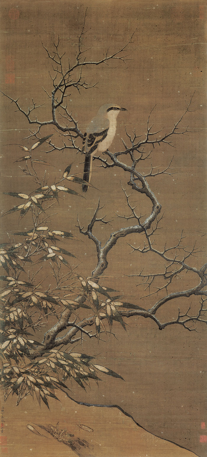 繪寒冷冬季,薄雪覆蓋竹葉,一只伯勞棲于棘樹上。伯勞以沒骨及鉤勒相結合繪出,羽毛蓬松,眼神靈動;以雙鉤寫竹、樹干,敷色渲染,雪與葉的完善結合,自然清晰;山坡以粗筆勾出,寫一叢衰草,更添雪意。