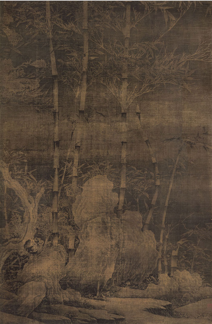 此卷描繪了竹林積雪的場景,畫面中一林竹樹在雪后高寒中拔地而起,堅韌挺拔,傾斜直上,竹竿枝葉姿態(tài)各異,在平靜安逸中又不失動感。此圖描繪生動寫實,將粗筆、細筆結合勾勒竹竿枝葉,以濃淡不同的墨色表現(xiàn)雪后竹子的不同層次,細致工整而富有立體感,再現(xiàn)了雪后竹石的真實情態(tài)。所繪景物僅以水墨描繪,不施色彩,整體的寫實畫風與畫史所載徐熙“以落墨為格”相符。此卷無作者款印,在石旁的竹竿上可見倒寫的篆書“此竹價重黃金百兩”八字。(來源:上海博物館官網(wǎng))