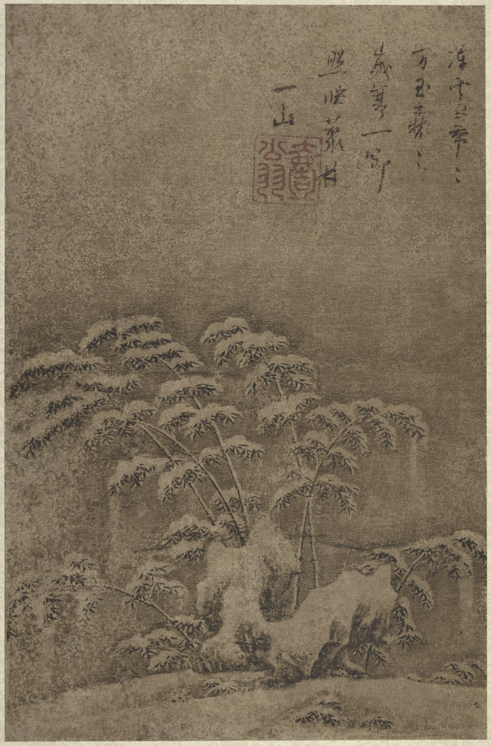 此幅繪雪中竹一叢,雪不用白粉,全以淡墨渲出,雖天寒地凍,而挺立不偃。圖無款,上有元代高僧一山一寧題贊,然此書跡與世傳一山書跡不同,是否是一山一寧之筆,俟知者考之。