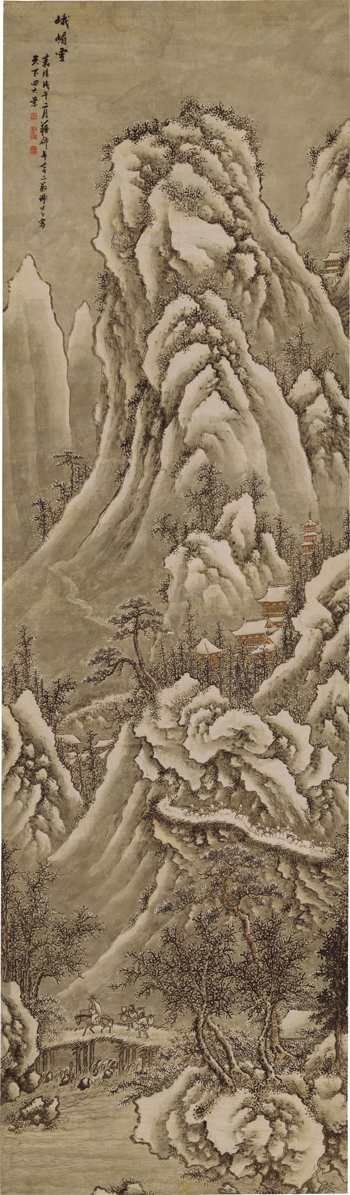 從題上看此是天下四大景之一,名:峨嵋雪。顧復的《平生壯觀》也記載了謝時臣所作蘇州察院公署堂壁畫“天下四大景”。作者在3米高的大幛上繪峨嵋山大雪紛飛,深山藏蘭若、民居。危棧上驢隊成行,山下一踏雪尋梅的文士躅躅而來,用筆雄蕩。