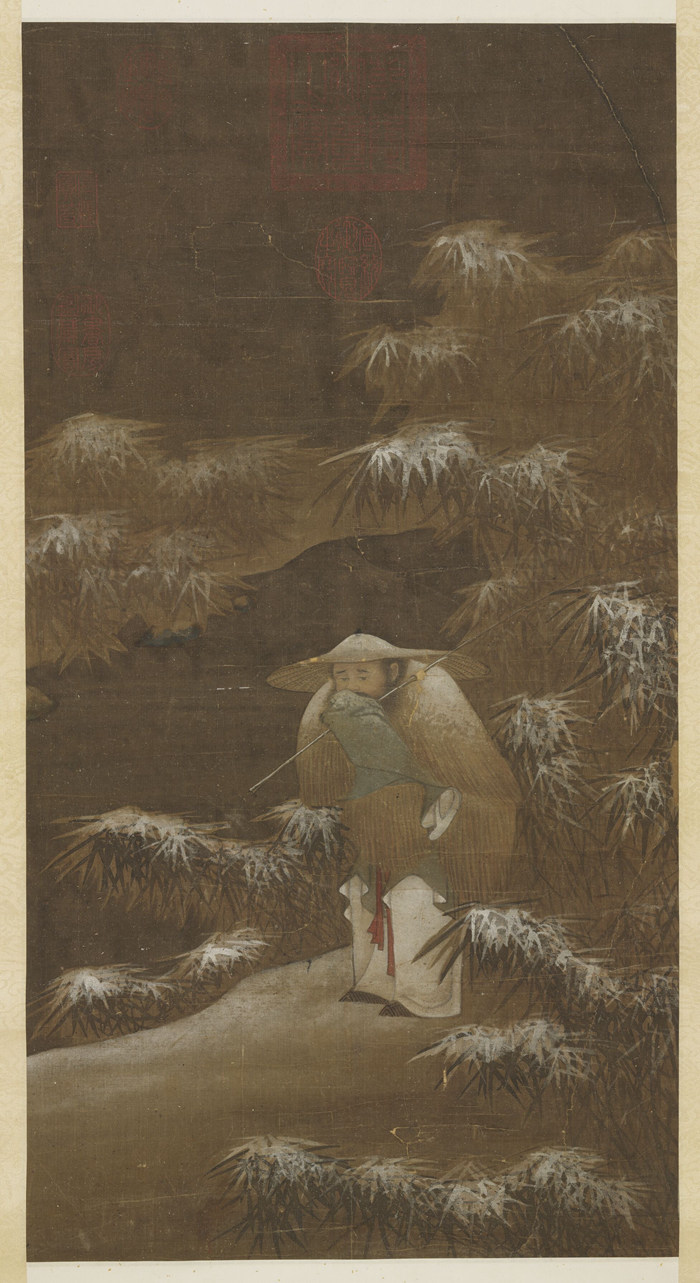 天空及江水用淡赭墨渲染而成,使整個背景看起來極具荒江冬寒的氣氛,頗符合北宋郭熙(11世紀)論畫所言“冬天云氣黯淡”的境地。江渚中的三個石塊,底部皆用石青襯出;畫雪竹則先略施淡墨,再以白粉加涂,令人深感積雪渾厚。此外,如蓑面、笠頂、江岸等處,無不以鉛粉敷染,以表示積雪;而漫布于空中的小白點,乃用白粉彈灑而成,此種畫法又稱“彈粉法”,即以鉛粉為白,彈灑于畫面,以表示片片雪花飛舞。人物表情的描寫極是生動,老翁縮頸掩口,雙眉呈八字型,眉毛、胡須除用墨染,還加用細筆描繪,仔細一瞧,并可發(fā)現(xiàn)鼻頭暈染成淡紅色,將那種畏縮于風雪的樣貌,栩栩如生地呈現(xiàn)出來。(撰稿:陳階晉)