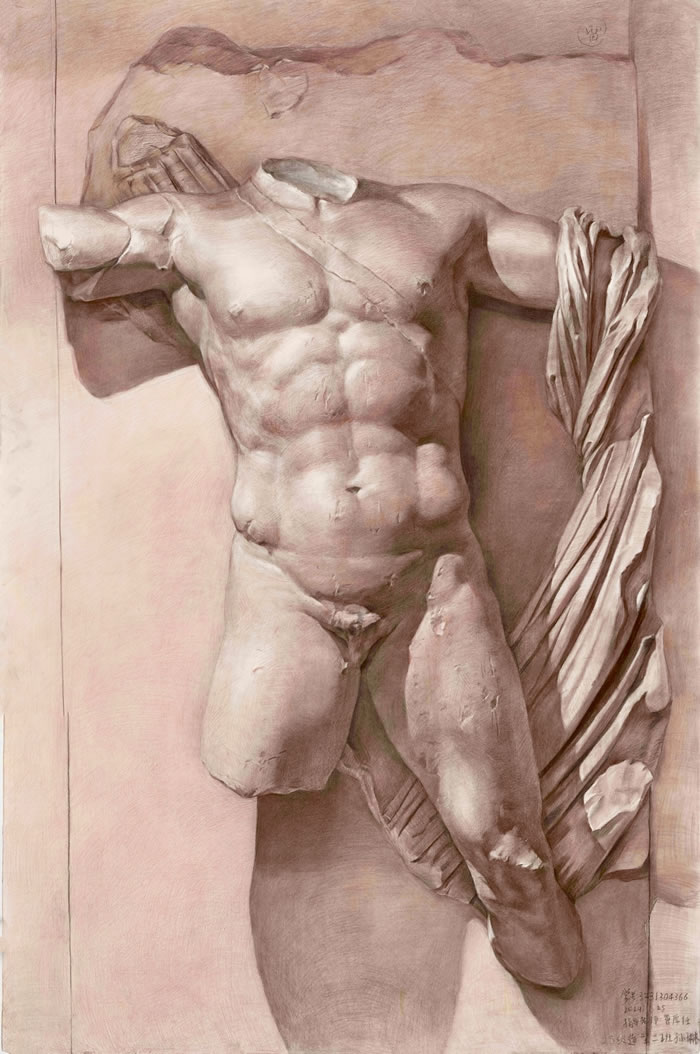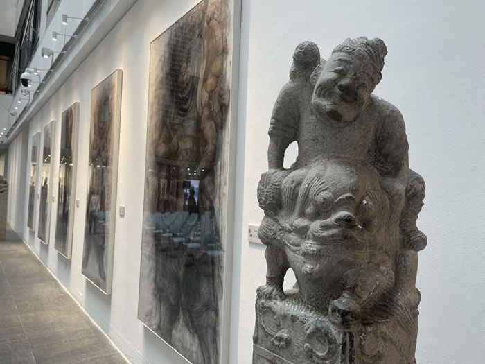 中西經(jīng)典研學(xué)踐行了“到源頭飲水,與偉大同行”的價(jià)值觀,將古希臘雕塑和中國(guó)傳統(tǒng)造像并置,為學(xué)生提供了中西互鑒的更廣域維度的思考。展廳中的拴馬樁承載著歷史的痕跡,見(jiàn)證著大一新生對(duì)于“經(jīng)典”的臨摹、描繪與研究,給人一種時(shí)空的滲透感。