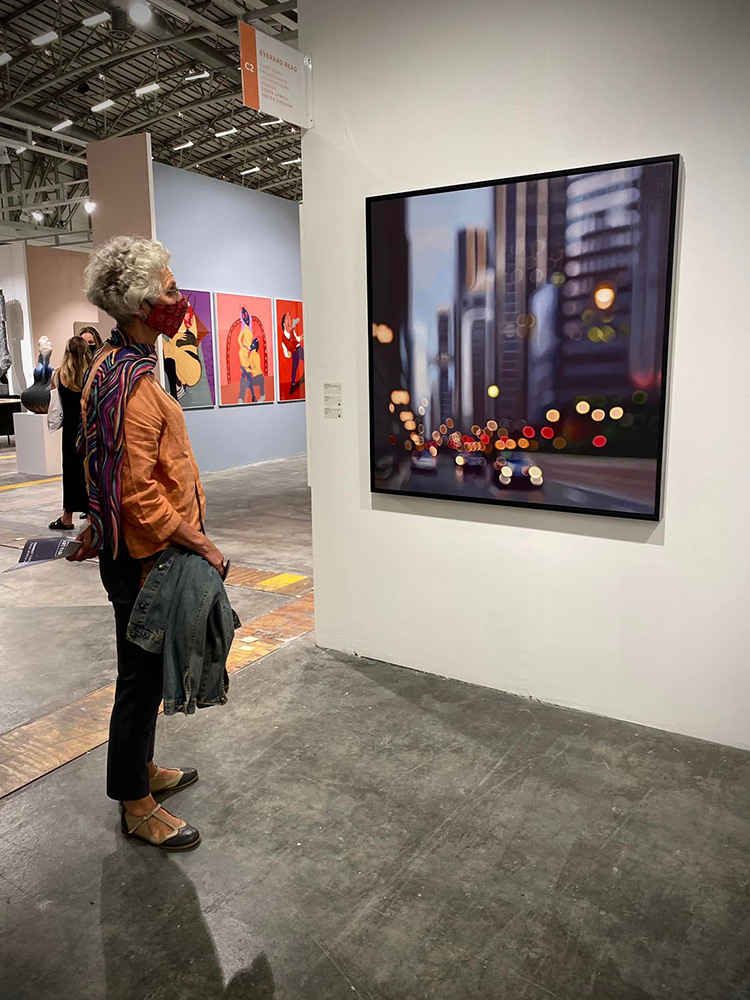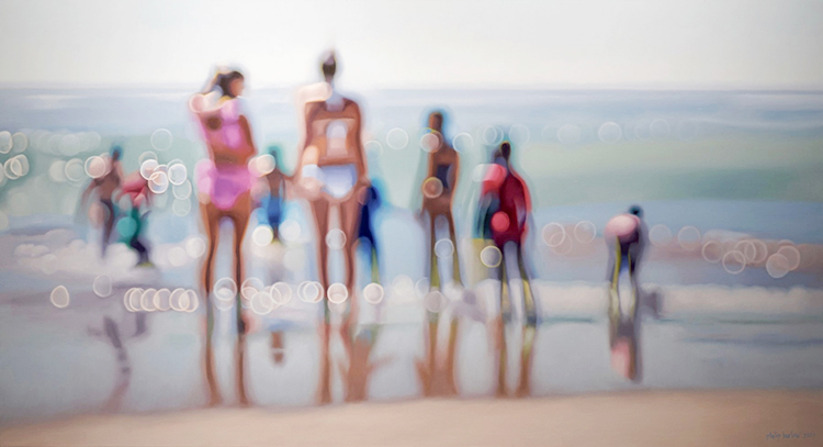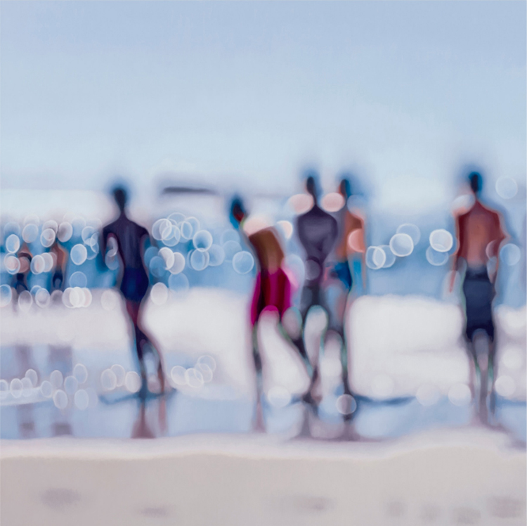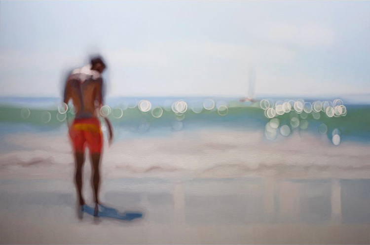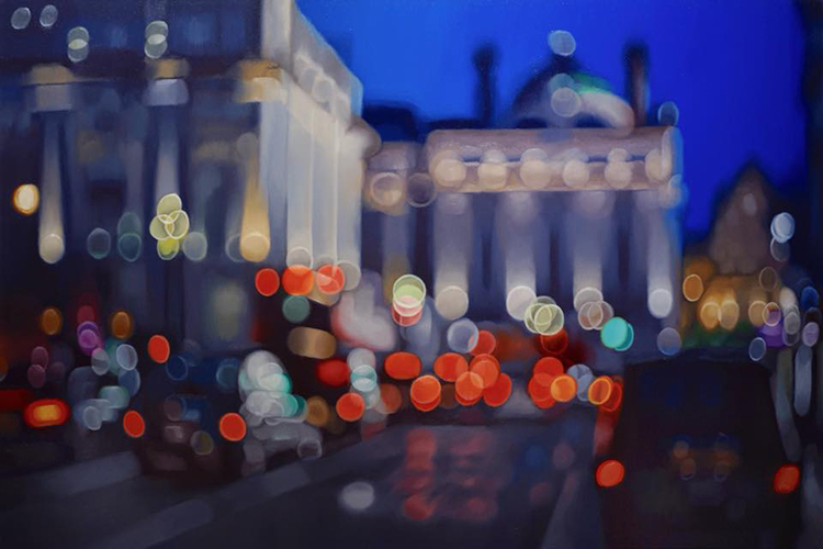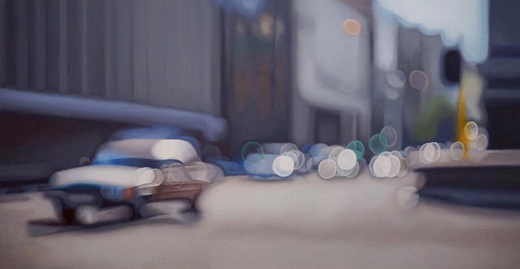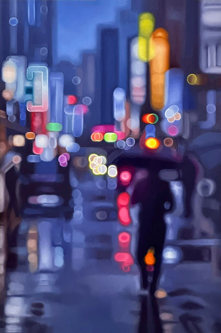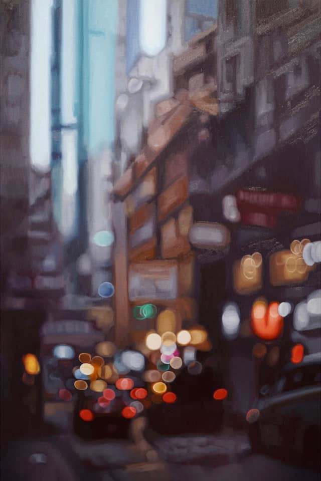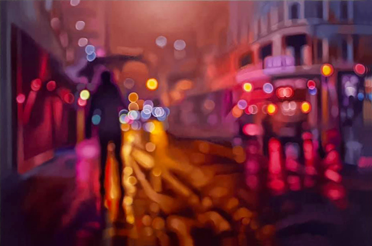 這就是菲利普?巴洛畫畫時(shí)追求的感覺:一切模糊朦朧,邊界消失,萬物一體。海浪上波光粼粼的自然反射、烈日下的反光、霓虹燈的光圈都成為了構(gòu)成畫面的點(diǎn)狀精髓元素,而他則圍繞這一點(diǎn)狀元素來進(jìn)行創(chuàng)作,這也是他最著名的三個(gè)系列:The City、The Night、The Sea的由來。