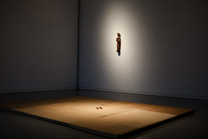 2022年,坂田和實因病離世。對于策展人?柳?太來說,展覽“古道具坂田:你我的選擇”像是一場與坂田先生內(nèi)心的對話,也是一次告別的行為?!耙粯钦箯d展示了坂田先生在一切事物中發(fā)現(xiàn)美的可能性。六樓的大展廳用自己的方式來呈現(xiàn)一種毋庸置疑的美;六樓小展廳更多的是對坂田先生的追憶,一個為他的靈魂祈禱的場所,表達謝意與告別的地方。門開得很窄,就像傳統(tǒng)日式茶室的入口,是一個屏障,暗示里面是一個不同尋常的空間。希望創(chuàng)造一種靜默感”。這間靜謐的展室鋪著“古道具坂田”店鋪結(jié)業(yè)(2020年)后遺留下的幾塊榻榻米,上面僅擺放有兩件因紐特人的船型護身符,至小的空間尺度,精神的棲居。墻上樸素的中世紀基督教圣像、墻角的插花“與先前琳瑯滿目的古道具展示形成鮮明對比”。留白的室內(nèi),“也代表了坂田先生逝世后留下的無法彌補的空白”。