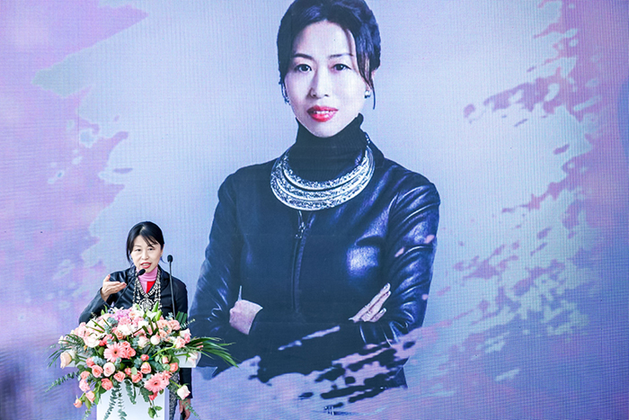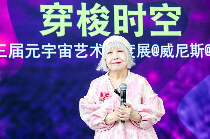 《穿梭時空》第三屆元宇宙藝術(shù)年度展@威尼斯策展人陸蓉之在新聞發(fā)布會現(xiàn)場發(fā)言。圖片由主辦方提供