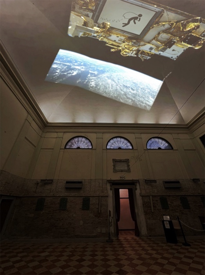 此次展覽將世界上第一部拍攝于外太空的定格動畫《衛(wèi)星上的湖泊》,呈現(xiàn)在教堂禮拜堂的天頂上。這部3分7秒的短片是利用一顆退役在軌衛(wèi)星“瓢蟲一號”拍攝。展覽中的作品借助火箭、衛(wèi)星等太空科技,從更廣闊的視角,追尋了一個從古延續(xù)至今的愿望,呼應(yīng)了圣塔 · 維內(nèi)蘭達(dá)教堂上雕刻的銘文“給意大利乃至全世界帶來光明與和平(all italia al mundo implore luce pace)。