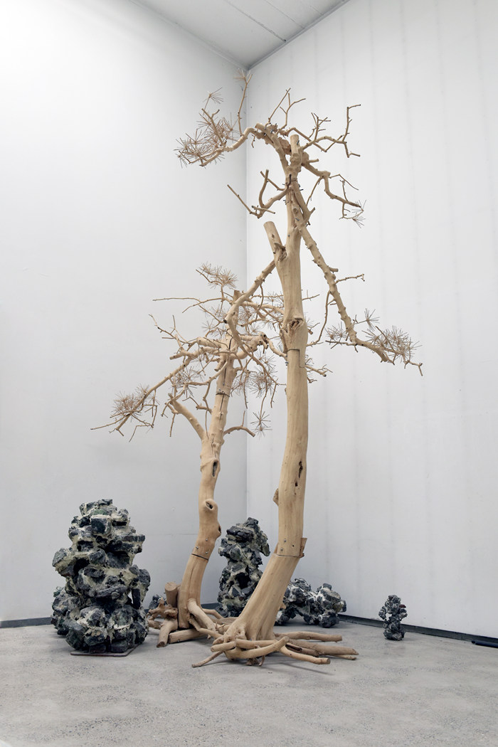 《雙松圖》史金淞 各種樹木殘骸,不銹鋼500×250×500 cm 2012年