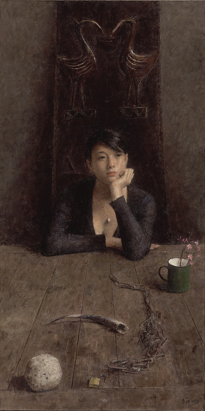 朱春林的人物畫作品傳達出平凡的普通人的尊嚴、安寧、靜謐、沉醉、永恒的生命狀態(tài),其背后則是創(chuàng)作主體對人類生命本身在時間的歷史長河中鮮活地感知和中國傳統(tǒng)繪畫中的文人士大夫的審美格調。朱春林的人物作品,通常將人物置于真實的日常生活場景之中,而這些日常生活場景中的物品又多為年代久遠的古物、舊物。他的新作舍棄了早期極致細膩的古典塑造、描繪筆法,而采用類似中國寫意畫中寫的方式,勾勒的方式,強調線條在造型中的作用和意蘊;他把塞尚式冷靜理智的“排點”改為類似中國寫意畫的“皴點”手法;他將油畫中的油汪汪的油性降低,變?yōu)轭愃浦袊鼗捅诋嫷摹胺蹞鋼洹焙臀鞣教古嗬瓭癖诋嫷乃貥悖源巳趸宋矬w和人物的質感、體積,也削弱了空間透視,消解了人為設定的崇高和神圣感,從而使整個畫面統(tǒng)一在一個寧靜而素樸、莊嚴卻柔和的光色體系中,共同沉醉在整體的安寧、靜謐和永恒氛圍里。