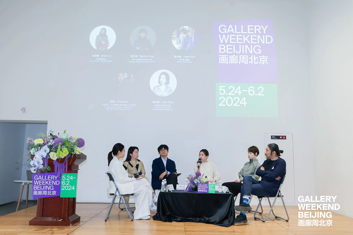 圓桌論壇環(huán)節(jié)中,馬刺畫廊合伙人來夢馨(Sherry Lai)、MACA美凱龍藝術(shù)中心總監(jiān)楊北辰、新勢力單元策展人袁佳維、北京當(dāng)代·藝術(shù)博覽會(huì)聯(lián)合創(chuàng)始人鮑棟及畫廊周北京項(xiàng)目總監(jiān)楊佳霖共同圍繞第八屆畫廊周北京的主題與變化、當(dāng)下北京生態(tài)藝術(shù)圈面臨的機(jī)遇與挑戰(zhàn)、中國藝術(shù)生態(tài)的未來等問題展開討論。(圖片由主辦方提供)