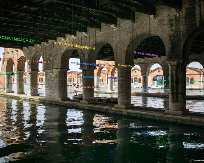 展覽開幕后,貼有威尼斯雙年展展覽海報(bào)的一艘艘客船載滿世界各地匯集于此的觀眾前往綠城花園和軍械庫,擁擠的人潮像是呼應(yīng)此屆雙年展的主題——“無處不在的外人”。本屆威尼斯雙年展由阿德里亞諾·佩德羅薩(Adriano Pedrosa)策展,展覽的主題來自意大利巴勒莫的藝術(shù)團(tuán)體克萊爾·方丹(Claire Fontaine)于2004年創(chuàng)作的霓虹燈系列作品,他們化用2000年初都靈一個(gè)反對(duì)種族主義集體的名字。不同語言的霓虹燈呈現(xiàn)“無處不在的外人”,作品懸掛于威尼斯軍械庫入口處的水面上,它們宣告著這屆雙年展的命題。