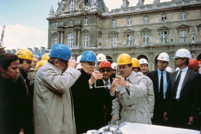 馬克·呂布 貝聿銘及法國總統(tǒng)弗朗索瓦·密特朗檢視羅浮宮金字塔的玻璃樣品 1987 年
