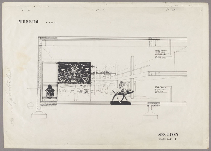 貝聿銘 哈佛大學(xué)建筑碩士論文中“上海中華藝術(shù)博物館”設(shè)計(jì)的剖面繪圖