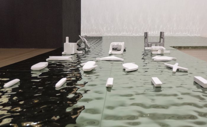 展廳地面鋪了反光的灰綠色波紋板,營造出一種內外貫通的海洋氛圍