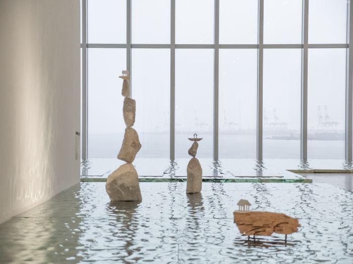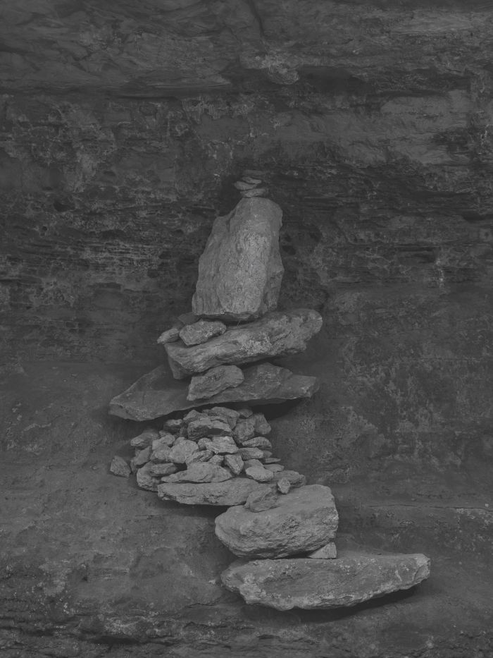 蔣斐然:策展團隊希望每件作品都能夠有所呼應,互相串連,在展覽現場形成連貫的敘述。盡管作品媒介形態(tài)各異,但相互呼應、對話,共同營造了一個相互貫通的現場。比如我們能看到其中一座仙山其實是一個洞天。在洞的入口處,一掛瀑布流下來。展陳方式借鑒了日式園林的造景手法,展出了林舒的攝影作品《鴆》,以黑色燈箱嵌入墻壁的展出方式,微弱的燈光打到作品上,影影綽綽能夠看到瀑布部分是光亮的,讓人仿佛置身于真實的洞天之中。而緊挨著這個洞口的,是另一個與該洞口完全等大的洞,只不過它是攝影作品——藝術家塔可的攝影作品《洞中觀音2》,拍攝內容是洞天中民間用石頭壘起來的觀音。這件作品不僅與林舒的洞天一左一右,有如一虛一實的兩個洞天相互呼應,同時也與洞外杉山功的《神居》系列雕塑作品構成形式上的互文,因為它們都同樣處理了堆疊石頭的作品形態(tài)。