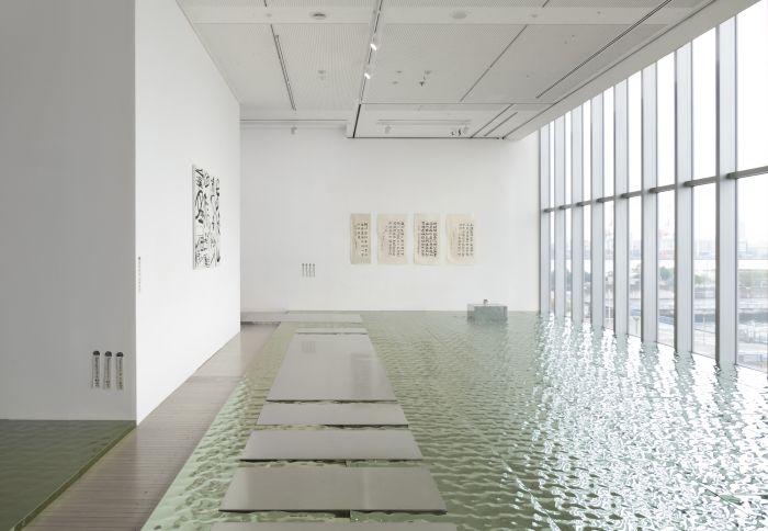 卓鶴君先生的作品《泉高入夢喧》在展廳中呈現為一件丈二的頂天立地畫作。我跟卓先生的家人講,作品不需要任何裝裱,就以大頭釘釘在展墻上,如一練瀑布飛流而下。這樣的展出方式,對于傳統(tǒng)書畫來講一定不是正常的展陳方式,但是我們邀請的藝術家們,在理解了整個展覽方案之后,都抱有非常開放的態(tài)度,愿意配合展覽的呈現。