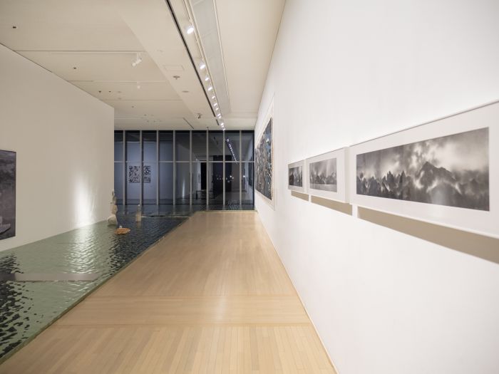 此外,展廳還做了三處墻體搭建,隱喻漂浮在“海面”之上的三座仙山;整個展覽現場構筑了“三山三境”的節(jié)奏,并綜合運用了光線營造了三種視覺意象:靠近海面的部分采用室外光,明亮寬闊,觀眾也會覺得心境開闊;中間部分則采用室內白光,形成三山合圍的對話;最后是一個內觀的區(qū)域,采用了暖色燈光,空間較暗,營造出一種關照內心的親密氛圍,引導觀眾進入內心深處的思考。展覽的節(jié)奏不僅實現了對“三山三境”的隱喻表達,更是拉出了中國傳統(tǒng)中國畫的三種視角——平遠、高遠、深遠。