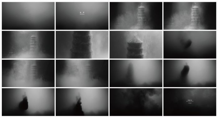 再舉一例,“塔”是在展廳中反復出現的視覺意象。比如在展廳的最后一個區(qū)域,一座仙山內部展出了管懷賓老師的影像作品《流隙》,影像內容是一座塔在水中慢慢消融的過程,極具禪宗意味。而與這件作品形成互補與對話關系的,是梁琛的《無止境塔》?!稛o止境塔》是一件新媒體燈光裝置,這座塔不斷螺旋式滾動、上升,指向的或許是一種當代的巴別塔,隱喻人類永遠向上求索,生生不息,向宇宙探尋的欲望;塔內的燈光照射到墻壁上,令人想到柏拉圖的洞穴隱喻,映照出幻象的現實。梁琛的“塔”突破了我們對佛塔的傳統(tǒng)意象,塔作為一種精神象征物,也代表著人類探索宇宙的野心,古代的人們望塔通天,今天的我們依然在通天的道路上沒有停止過。這件不同形式的塔,無論是在媒介含義還是在精神內涵上,都給展覽疊加了另一個維度的解讀。