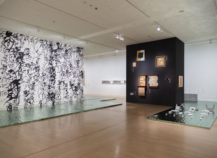 再比如,在正對著海面的白墻上,也就是整個展廳最開闊的一個位置,我們只展出了宇野雪村的一幅書法作品《白日依山》,內容寫的就是那首家喻戶曉的“白日依山盡,黃河入海流,欲窮千里目,更上一層樓”,尤其符合現場這個位置的開闊意境。而《白日依山》的前奏,則是一件長達13米的《唐詩之路圖》,是中國美術學院林海鐘師生團隊的集體創(chuàng)作,他們重走浙東唐詩之路,最終共同創(chuàng)作完成這件杰作。只有經過漫長的浙東唐詩之路的游歷,才能抵達海上之路的寬闊。在《白日依山》的旁邊,還展出了賴少其的四聯唐詩書法,賴少其曾赴大阪,與日友人共同協(xié)商中國書法家協(xié)會的創(chuàng)立,此番作品重回大阪,成為歷史和當下相互接連的見證和窗口。而《白日依山》相反的展廳的另一端,則是魯大東的現場創(chuàng)作《何時明月》,現場題壁日本版本的唐代李白《靜夜思》。這件《何時明月》與宇野雪村的《白日依山》在現場遙相呼應,他們都以不同于傳統(tǒng)書法的方式書寫,路徑又不通,在日與月、白晝與夜晚形成了有趣的呼應。