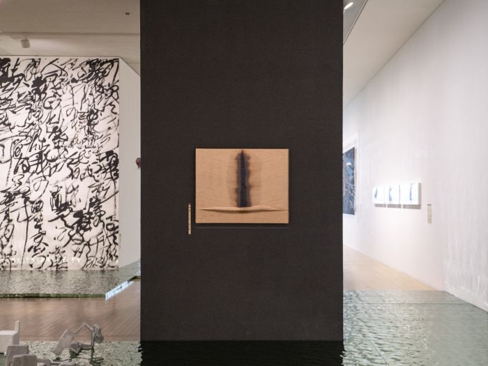 展場入口設計成了狹窄的入口,走進去面向展廳,左側即是“海上求仙客,三山望幾時”,右側是日本具體派代表人物前川強的綜合繪畫。前川強的作品作為展覽的引子,寓意開門見山。這座山乍眼看是非常靜的,再看卻充滿動勢,麻布的紋理清晰可見,畫面中間如劈了一刀,有“兩岸青山相對出”的視角。