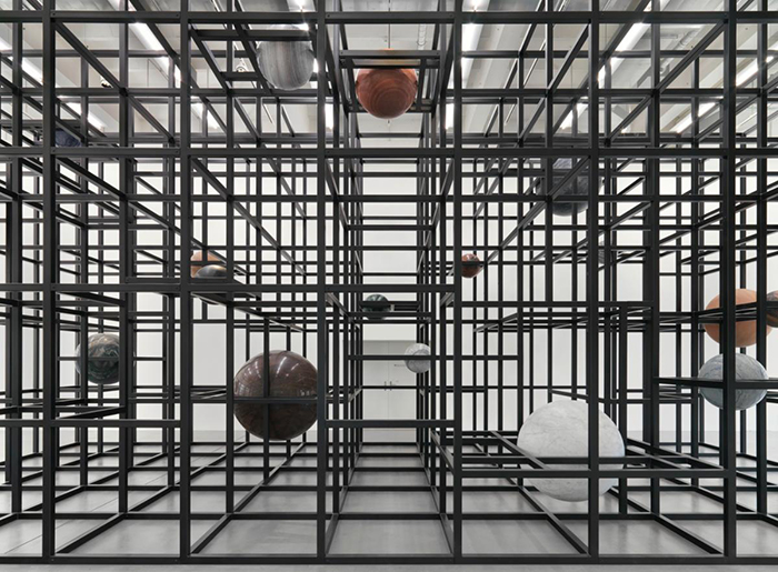 如果說亞歷山大·考爾德的作品打破固守的空間準(zhǔn)則,從而賦予了雕塑動態(tài)的美感,那么阿莉恰·克瓦德(Alicja Kwade)則重新以簡約且概念化的金屬線條將碩大的大理石球懸置空中,再現(xiàn)了現(xiàn)代社會隱秘且脆弱的一面。