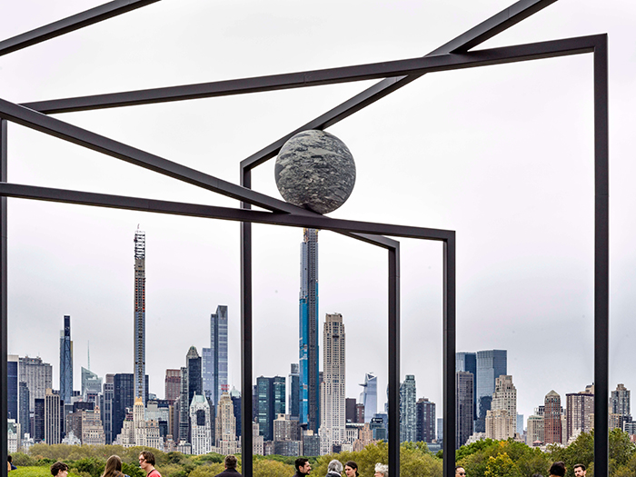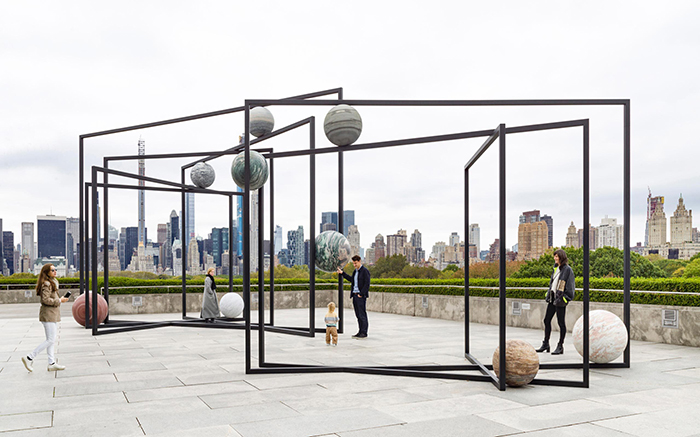 2019年,克瓦德受邀為紐約大都會藝術(shù)博物館的屋頂花園設(shè)計年度裝置,創(chuàng)作了備受矚目的《ParaPivot》。該作品由幾何形狀的黑色鋼框架構(gòu)成,框架之間懸掛著幾個巨大的巖石球體。作品整體形似一個微縮的太陽系,球體在框架中自由懸浮,與曼哈頓的天際線交相輝映。借此作品,克瓦德探討了重力、物質(zhì)的狀態(tài)轉(zhuǎn)換以及人類在宇宙中的渺小存在,讓觀眾在漫步中體驗到時間和空間的相對性和多維度。