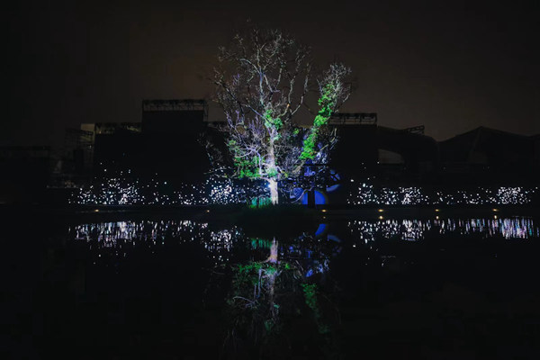 “仰觀”開幕儀式由譚彬團隊《奇點上的樹》正式啟動。在“參天”啟幕儀式中,良渚校區(qū)水庭中央的一棵無名之樹作為真實世界的附體,從它的枝叉中幻化出漫天星斗,在群星閃耀之間進入深空,直至飛向五千光年外的一顆恒星,在那里我們希望接通上古良渚五千年文明的微光,將這束光邀請到現(xiàn)場,邀請到每一個畢業(yè)生的最難忘的生命時刻。