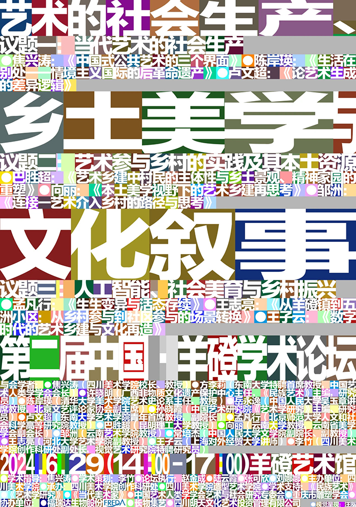 2024年6月29日下午,由四川美術(shù)學(xué)院主辦,四川美術(shù)學(xué)院創(chuàng)作科研處副處長李竹擔任學(xué)術(shù)策劃的第二屆中國羊磴·學(xué)術(shù)論壇在羊磴藝術(shù)館成功舉辦,活動邀請了羊磴鎮(zhèn)居民、四川美術(shù)學(xué)院師生及當?shù)厮囆g(shù)家共同參與,15位來自全國的藝術(shù)領(lǐng)域多方面專家學(xué)者圍繞主題“藝術(shù)的社會生產(chǎn)、鄉(xiāng)土美學(xué)與文化敘事”,分三個議題展開探討,為鄉(xiāng)村特色藝術(shù)教育課程建設(shè)與人才培養(yǎng)提供了寶貴建議。