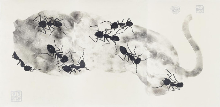 在本次展覽中,申暎浩特別創(chuàng)作了一幅4米長(zhǎng)的水墨畫(huà)《游牧》(Nomad),畫(huà)中的"螞蟻"是他從 2017年早期的《游牧系列》中演變而來(lái)的獨(dú)特形象,通過(guò)螞蟻的有限視角對(duì)現(xiàn)代生活進(jìn)行了反思。藝術(shù)家在接受采訪時(shí)提到,在中央美術(shù)學(xué)院研究書(shū)法的過(guò)程給他的這一系列創(chuàng)作帶來(lái)了很大的啟示,在畫(huà)面上制造螞蟻就像分解中國(guó)書(shū)法的筆劃一樣,作為元素和材料出現(xiàn)。在看過(guò)系列作品之后,我們發(fā)現(xiàn)也許重要的不是螞蟻,而是螞蟻攀附在睡虎、陶罐上的過(guò)程,重要的是螞蟻用身體感知的那個(gè)形象。